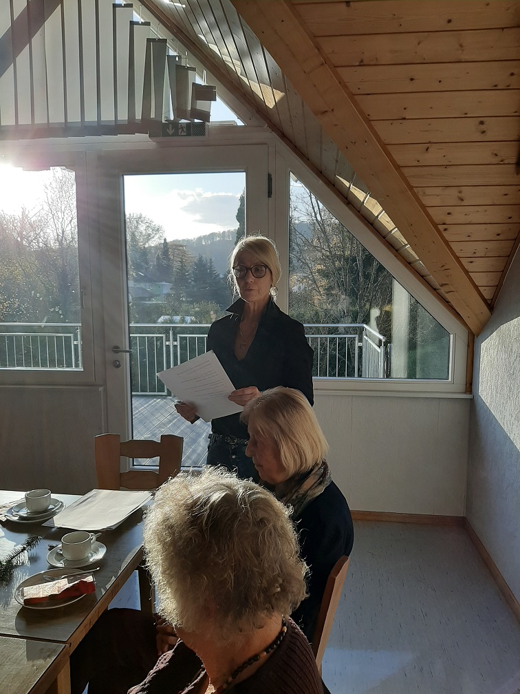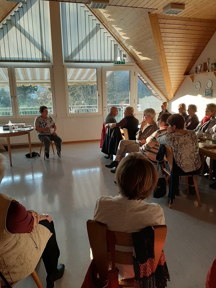 Annette Gärtner begrüßt die Gäste mit netten Worten. Wie jedes Jahr trug sie auch ein selbst geschriebenes Gedicht vor. Der Nachmittag wurde dieses Mal mit einer Lesung von Rita Hausen aus Walldorf „gewürzt“. Rita Hausen war früher Lehrerin am Walldorfer Gymnasium gewesen. Da sie schon immer gerne geschrieben hat, verfasst sie in ihrem Ruhestand Romane, Krimis und Kurzgeschichten. Sie entführte uns in ihrer ersten Kurzgeschichte in die Welt der Kunst. Ein Bild von Caspar-David-Friedrich – Wanderer im Nebel – hat sie zu einer kuriosen Idee gebracht, die uns alle schmunzeln ließ. Die nächste Geschichte ist nebst Rezept für einen Wildschweinbraten in einem Pfälzischen Weihnachtsbuch verewigt. Kriminalistisch makaber! Was Pfarrersfrauen so alles zuwege bringen, konnten wir danach erfahren. Gewisse Kräutersafte lassen sich nach geraumer Zeit nicht mehr im Körper nachweisen und eignen sich daher für die Beseitigung von unliebsamen Personen. Zum Abschluss bekamen wir dann noch 2 Märchen vorgelesen, die einen versöhnlicheren Ausgang als das Original hatten.