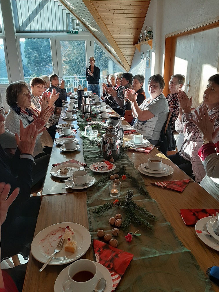 Es war kurios, Ende November schien die Sonne so intensiv in den Aufenthaltsraum des TV Bammental, dass wir sogar die Markise ausfahren mussten! – Annette Gärtner und Annerose Ruf des Turngau Heidelberg haben wie jedes Jahr alle engagierten Übungsleiter eingeladen, um gemeinsam den Jahresabschluss zu feiern. Die Tafel war festlich gedeckt, der Kaffee duftete und die Kuchen sahen verführerisch aus. Die Gäste kamen in Scharen, denn dieses Treffen darf man sich nicht entgehen lassen. Durch die Vertrautheit untereinander dauert es nicht lange, bis eine wohlige Gesprächswolke über den Frauen schwebt. Beim Kuchenessen muss sich keine zurückhalten, denn das ganze Jahr über wird ja ausgiebig Gymnastik gemacht.