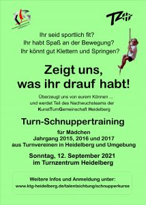Voraussetzung zur Teilnahme ist Interesse am leistungsorientierten Wettkampfturnen, Spaß an der Bewegung und am Turnen und Interesse an der Teilnahme am Training im Turnzentrum Heidelberg. Während des Schnuppertrainings haben alle Mädchen die Gelegenheit ihr sportliches Talent zu präsentieren, um sich für die Nachwuchsgruppen der KTG Heidelberg zu empfehlen.