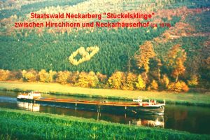 Weg entlang der Bahngleise, dann über Streuobstwiesen vorbei am Hirschhorner Galgenplatz, an dem eine Tafel an diesen schaurigen Ort erinnert. Gegenüber auf der badischen Neckarseite wurde an ein in den Waldbestand eingepflanztes badisches Wappen erinnert, das heute leider nicht mehr sichtbar ist, weil die dort vorherrschenden Douglasien die Japanlärchen verdrängt oder überwachsen haben. Ein Bild erinnert an dieses Zeitzeugnis.