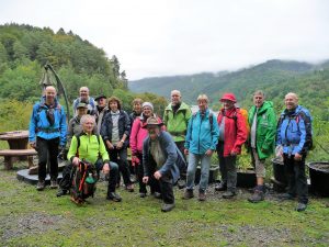 der Wandergruppe war die ersehnte Burgfeste Dilsberg vorbei am Treidelpfad auf der linken Neckarseite. Sie ist bekannt für ihren fantastischen Rundblick über das Neckartal und den Odenwald – nur nicht an diesem Tag, denn es regnete dauerhaftseit dem Vormittag und von Weitblick keine Spur. Man war froh, für eine kurze Zeit Unterstand in der evangelischen Kirche bekommen zu haben, um den weiteren Erläuterungen vom Archivar zum geschichtlichen Verlauf und den Verflechtungen der Besitzverhältnisse der Ortschaften von Dilsberg bis Hirschhorn und Eberbach zu