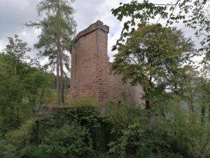 Am Freitag hatten wir der Wetterprognosen wegen eine Planänderung und konnten die Route zur Burgruine Stolzeneck bei Eberbach-Rockenau in Angriff nehmen. Das Heilig-Kreuz-Kirchlein auf Gemarkung der Staufferstadt Eberbach hielt uns nicht lange auf, denn es wartete das Stolzeneck – zu erreichen über den Urwaldpfad vorbei am Auberg-Brünnle.