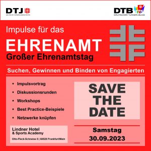Der Ehrenamtstag von Deutschem Turner-Bund (DTB) und Deutscher Turnerjugend (DTJ) am 30.09.2023 in Frankfurt am Main beschäftigt sich mit dem ganzen Spektrum rund um Ehrenamt und Engagement. Fachkundige Expert*innen regen im Rahmen von Vorträgen, Diskussionsrunden und Workshops zu neuen Wegen an und wollen Mutmacher*innen sein. Die Veranstaltung bietet darüber hinaus die Möglichkeit, sich mit anderen zu vernetzen, um auch nach dem Ehrenamtstag im Austausch zu bleiben und gemeinsam in die Zukunft aufzubrechen.