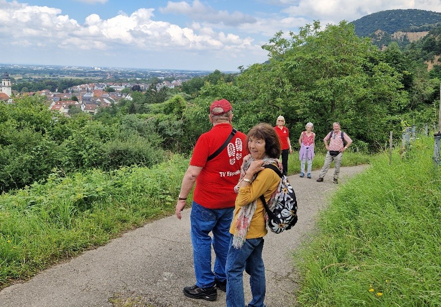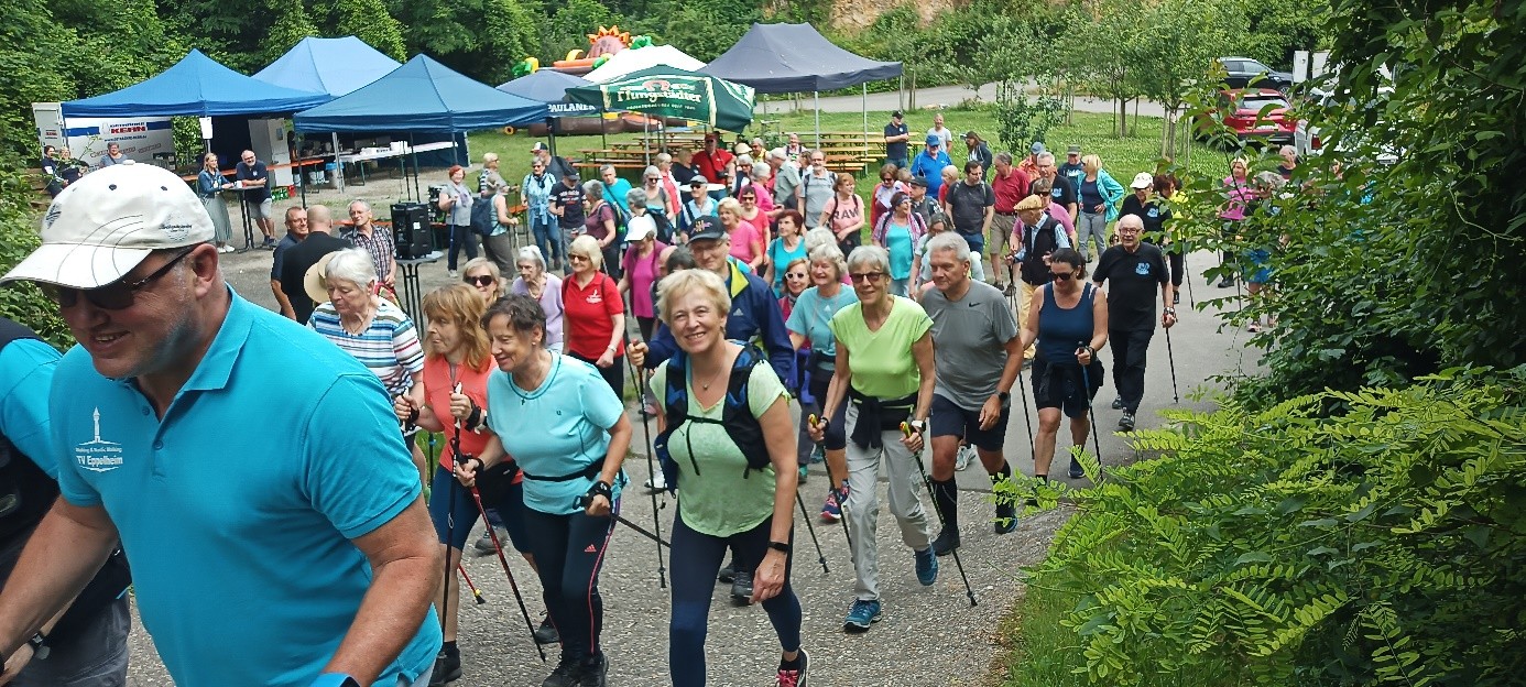 Als hätten die Dossenheimer das schöne Wetter gepachtet, denn auch in diesem Jahr konnten am Sonntag, 23. Juni wieder vom Steinbruch aus die ausgeschriebenen Wanderrouten in Angriff genommen werden und das bei herrlichem Wanderwetter. Die DJK Dossenheim war wieder Ausrichter des Gauwandertages, gleichzeitig Wander- und Walkingtreff beim ausrichtenden Verein immer nach der Sonnenwendfeier. Mit 75 Voranmeldungen aber tatsächlich über 90 Teilnehmenden durfte man seitens des Veranstalters zufrieden sein. Walker und Wanderer warteten auf den Startschuss durch Bürger­meister David Faulhaber. Das war ein schönes Bild. Wanderer und Walker mit und ohne Stöcke, mit Ruck­sack und ohne Rucksack – jeder so wie es seinem Bedürfnis entsprach, waren unterwegs auf sechs, elf oder 14 Kilometer. Der Einstieg war recht steil und sorgte gleich am Anfang für eine Pulserhöhung. Wenn sich jemand dieses Teilstück nicht zumutete, wurde man mit dem Pkw hochgefahren. Pflegestationen an den „Drei Eichen“ und der Hütte bei den „Zimmerholzwiesen“ sorgten mit Getränken und Obst dafür, dass alle bei Kräften blieben. Zurück am Ziel gab es eine Stärkung mit einem Mittagessen und Kaffee und Kuchen. Die schöne Bergstraßenlandschaft mit Ausblick in die Rheinebene konnte man sich revuepassieren lassen beim gemütlichen Plausch mit Gleichgesinnten. Die Ehrung durch Verein und Turngau folgte im Anschluss. Beide Pokale blieben in Dossenheim. Die TSG Germania hatte die größte Wander- und Walkinggruppe am Start. Älteste Teilnehmer waren zwei 85-jährige, die ein kleines Präsent erhielten. Die Musikband um Ehrenvorsitzenden Wolfgang Gehrig sorgte für gute Stimmung. Auch für das Folgejahr hat sich die DJK zur Ausrichtung bereit erklärt, da sich kein anderer Verein dies übernehmen wollte. Christel Bachert von der TSG Dossenheim (links) mit dem Wanderpokal für Wandern und Jutta Bauer ebenfalls von der TSG Dossenheim mit dem Wanderpokal Nord. Walking umrahmt von Teilnehmern der Siegermannschaften sowie Klaus Krischke (links) u. Reinhard Zettl (hinten). Reinhard Zettl Wanderwart im Turngau Heidelberg