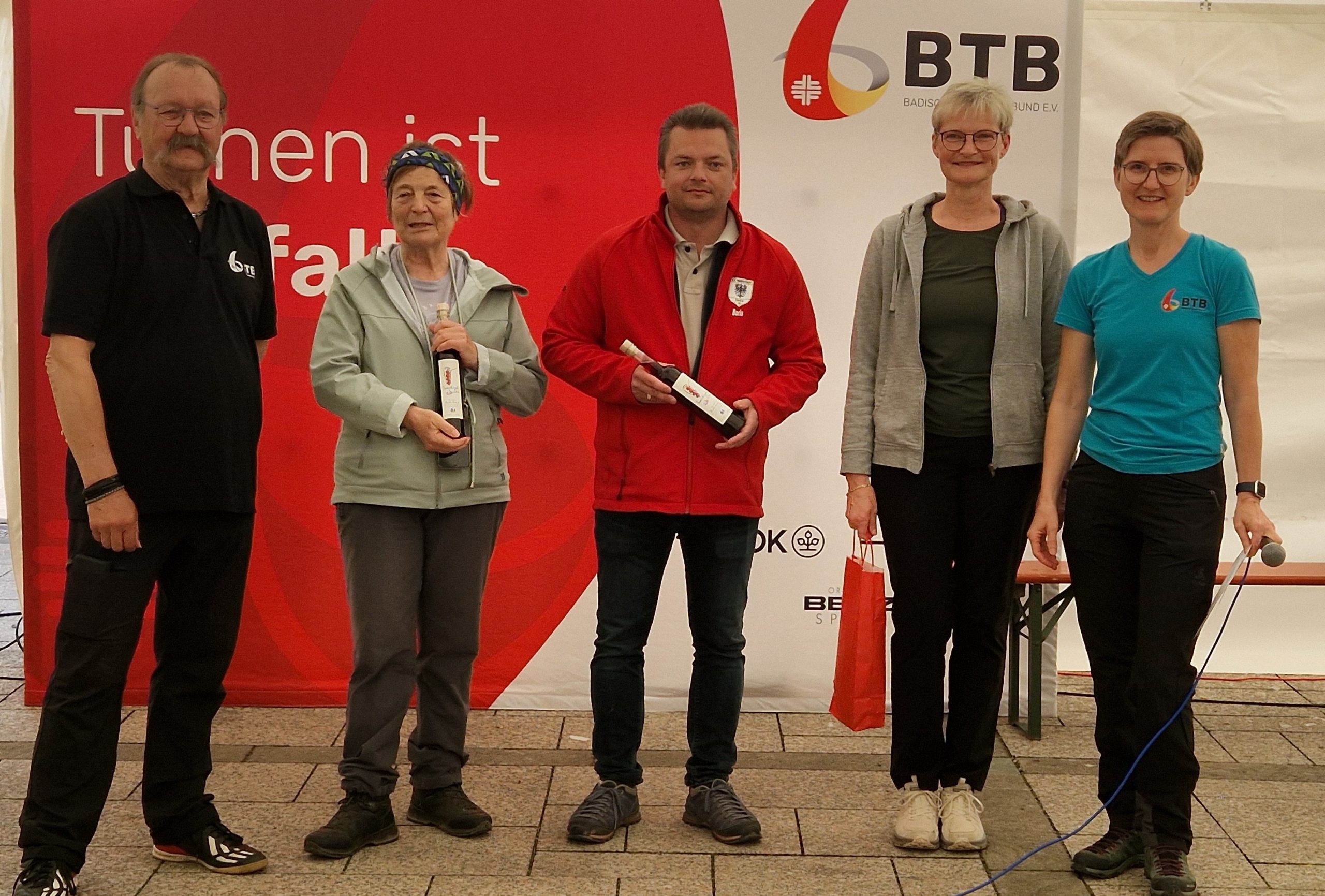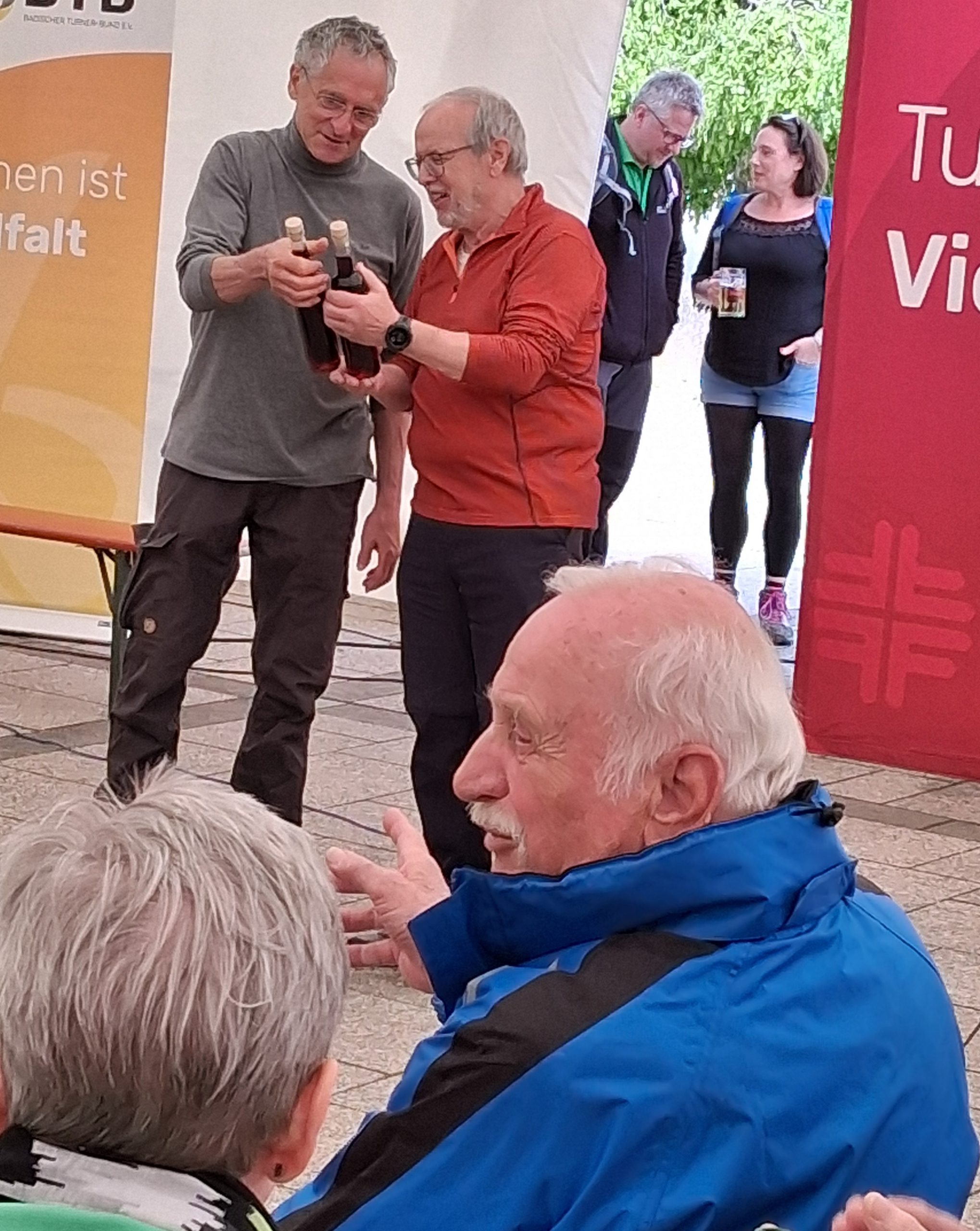 Das anschließende gesellige Beisammensein zur Musik und auch zur Ehrung der teilnahmegrößten Vereine und Gaue ließ das Zelt aus allen Nähten platzen. Freuen konnte sich die TSG Dossenheim über den 3. Platz der teilnahmestärksten Vereine. Christel Bachert konnte für die Gruppe eine Flasche Hochprozentiges von der ortsansässigen Destille in Empfang nehmen. Ebenso war dies Reinhard Zettl als Gauwanderwart für den drittgrößten Turngau wie unsere Bilder zeigen. Der Turngau Mittelbaden-Murgtal war mit 7 Wanderern Vorsprung auf den 2. Platz gerutscht.