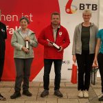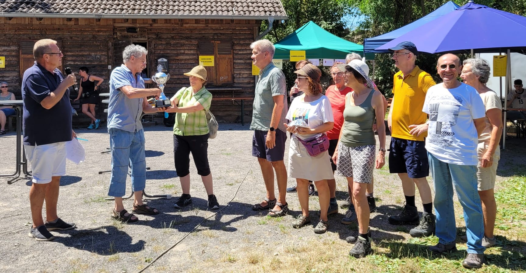 Den Startschuss pünktlich um 10 Uhr gab wieder einmal David Faulhaber, seines Zeichens Bürgermeister von „Dossene“. Auf 3 Strecken konnten sich die Walker und jung gebliebenen Wanderer austoben. Eigentlich steht das Genießen der Odenwaldlandschaft im Vordergrund verbunden mit einer sportlichen Betätigung zur Erhaltung der körperlichen Gesundheit. Der anfängliche steilere Anstieg war für die meisten keine Herausforderung. Wer sich das nicht zutraute, konnte zum ersten Verpflegungspunkt an den „Drei Eichen“ chauffiert werden. Weiterer Bonus war die ersehnte Urkunde nach Rückmeldung der Wanderung. Für die Verpflegung auf der Strecke und der Urkunde wurde ein Obolus in Höhe von 5 Euro vor dem Start entrichtet. Bei dem wieder schönen und warmen Wetter war man am Ziel über ein schattiges Plätzchen froh und genoss Speisen und Getränke sowie Kaffee und Kuchen. Die Mannschaft der DJK hatte alles wieder bestens im Griff und alle konnten der nachfolgenden Ehrung der größten Gruppen und des ältesten Teilnehmers durch den Turngau und des Vereins lauschen. Die TSG Dossenheim hatte sowohl bei den Wanderern als auch bei den Nordic-Walkern die Nase vorn und konnten den Pokal, der jedes Jahr für die entsprechende Natursportart weitergegeben wird, von Christel Bachert und Jutta Bauer entgegennehmen.