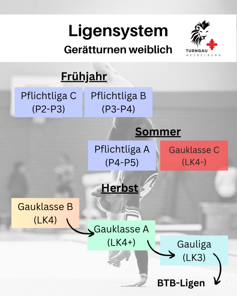Hier im Turngau Heidelberg bieten wir ein durchgängiges Ligasystem im weiblichen Bereich, das von den P-Stufen bis hin zu den Leistungsklassen (LK) reicht. Dieses umfassende System ermöglicht es Turnerinnen aller Alters- und Leistungsstufen, sich zu entwickeln, an Wettkämpfen teilzunehmen und ihr Können unter Beweis zu stellen.